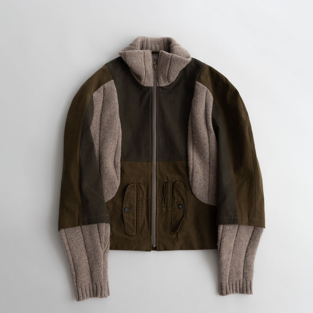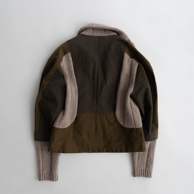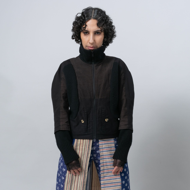 The Blouson Jacket brings together traditional materials like canvas and wool with a retro-futuristic cut. The slightly puffy raglan sleeves add a feminine element to the otherwise utilitarian look. It is a shorter jacket that sits fitted around the waist and comes with long knit sleeve cuffs. The cut incorporates the original pants pockets and places the knit to provide the cozyness & comfort of a warm sweater. The jacket is lined with a deadstock nylon material with wind-breaking qualities.