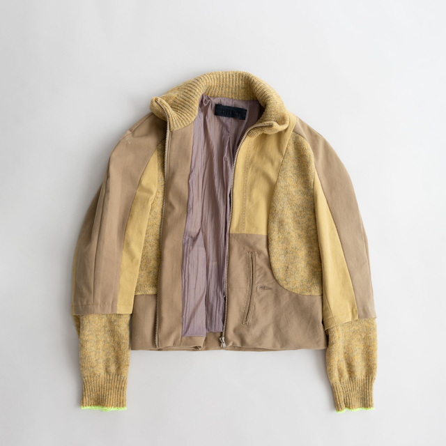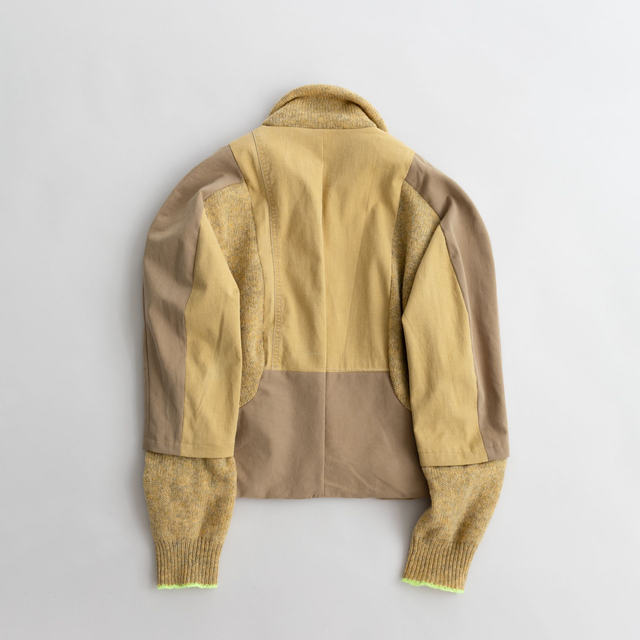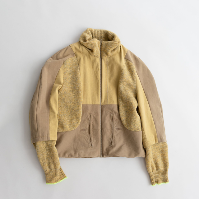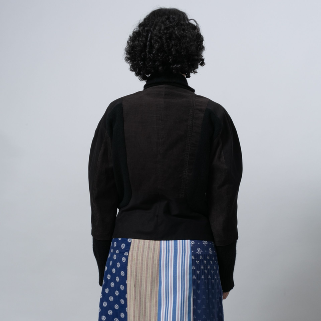 The Blouson Jacket brings together traditional materials like canvas and wool with a retro-futuristic cut. The slightly puffy raglan sleeves add a feminine element to the otherwise utilitarian look. It is a shorter jacket that sits fitted around the waist and comes with long knit sleeve cuffs. The cut incorporates the original pants pockets and places the knit to provide the cozyness & comfort of a warm sweater. The jacket is lined with a deadstock nylon material with wind-breaking qualities.